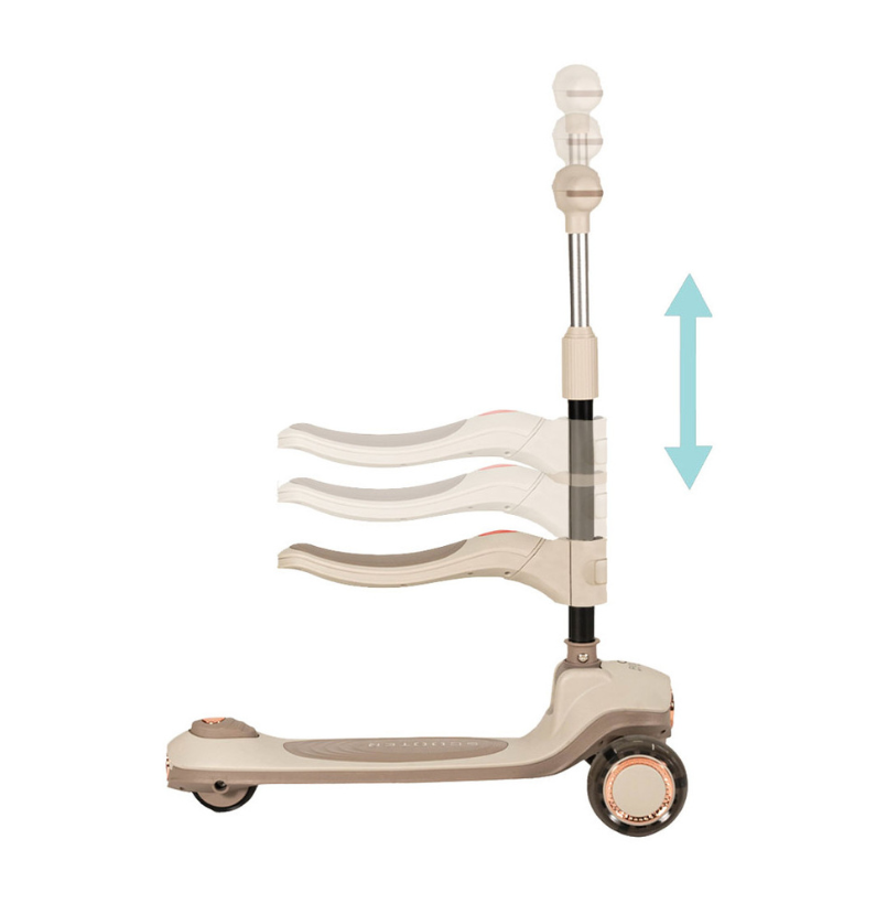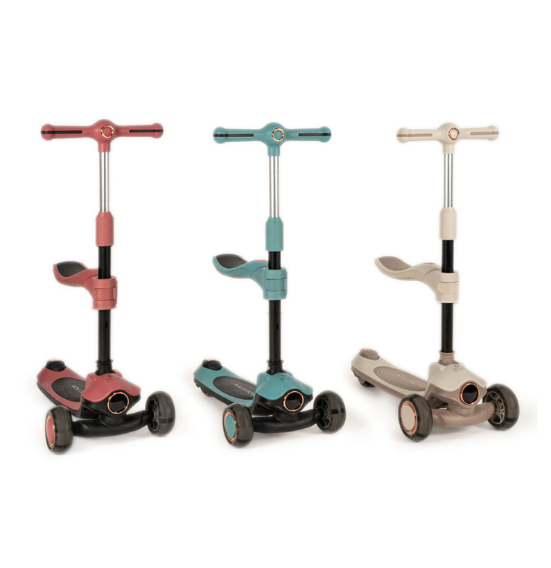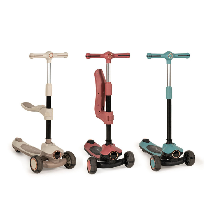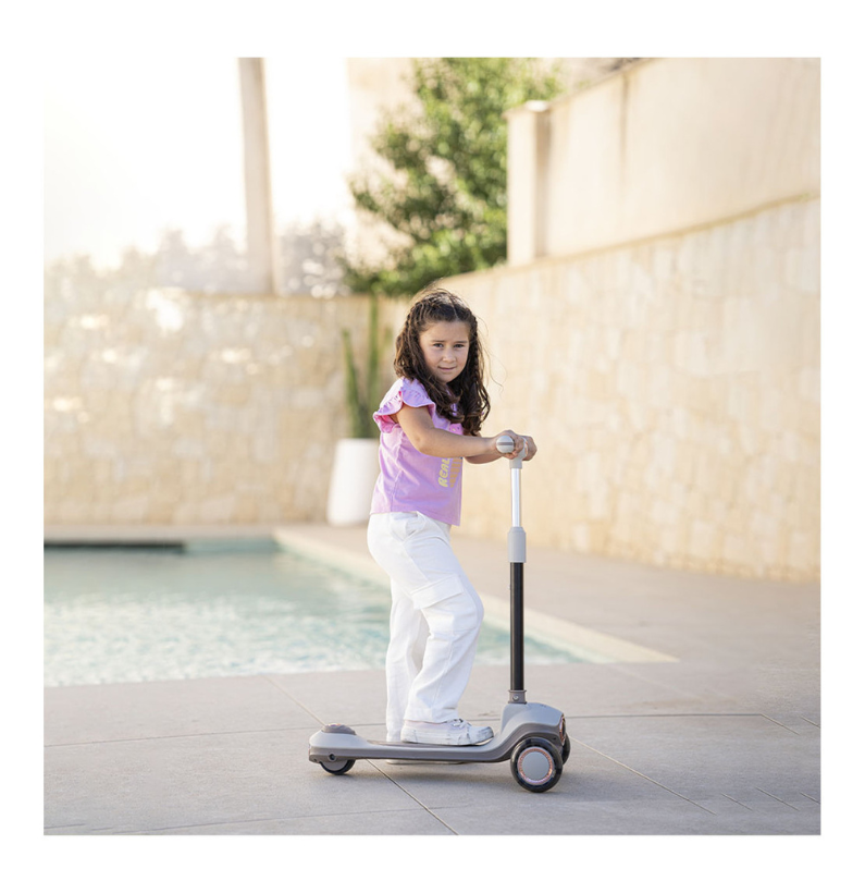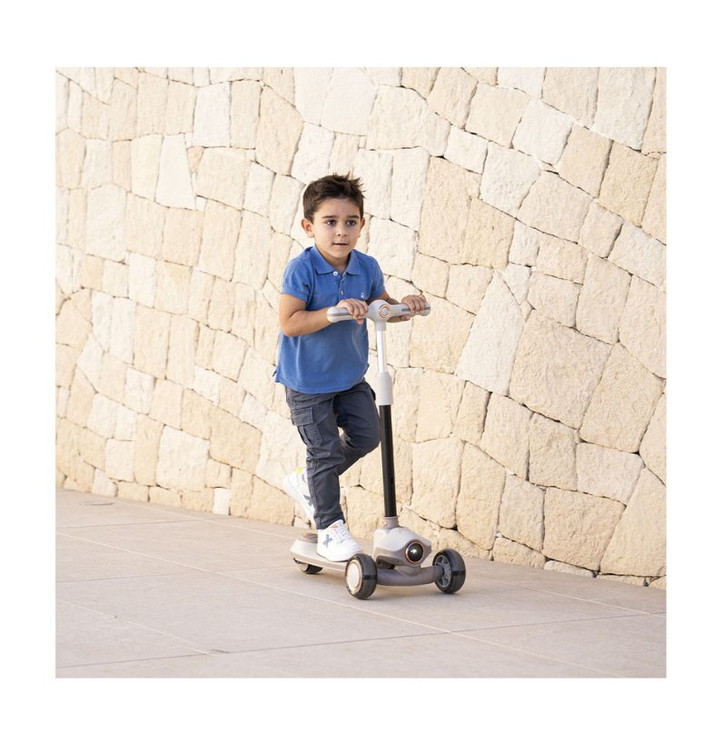 Com um design inteligente e evolutivo, adapta-se facilmente às diferentes fases de crescimento. Pode ser utilizada como andador a partir dos 12 meses, permitindo que a criança ganhe confiança ao dar os primeiros passos, e transforma-se em trotinete a partir dos 24 meses, proporcionando maior liberdade e mobilidade à medida que as suas capacidades motoras evoluem. Esta transição é fácil e rápida, sem necessidade de ferramentas complexas.