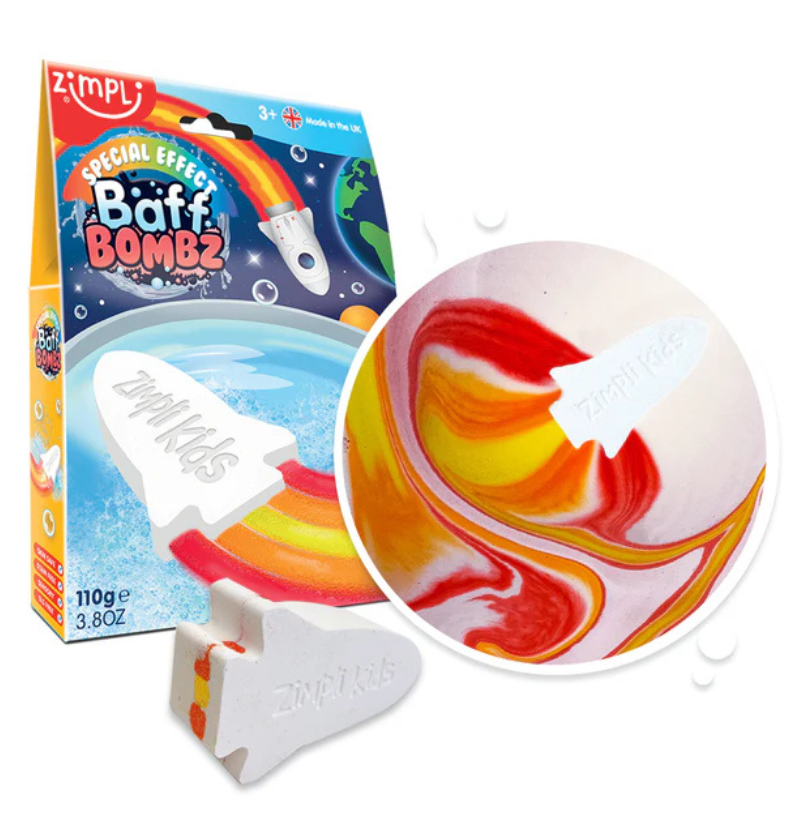 Transforme o banho numa aventura espacial com a Zimpli Bomba de Banho Foguetão! Basta colocar a bomba na água e ver chamas multicoloridas explodirem na banheira. Seguro para a pele, não mancha, fácil de limpar e biodegradável — diversão mágica garantida!