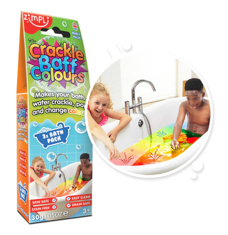 Dê cor e diversão à hora do banho com o Zimpli Crackle Baff Colours Pack! Basta espalhar o pó na água e ouvir o estalo mágico enquanto a água muda de cor. Seguro para a pele, não mancha e fácil de limpar — banho divertido garantido!
